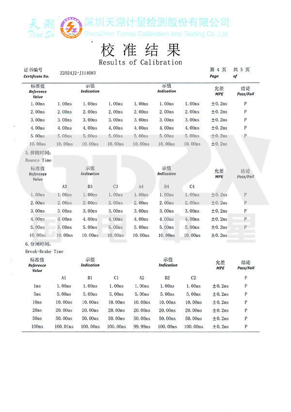 ⑷、可測斷口合、分閘時間、三相不同期、彈跳時間及次數(shù)